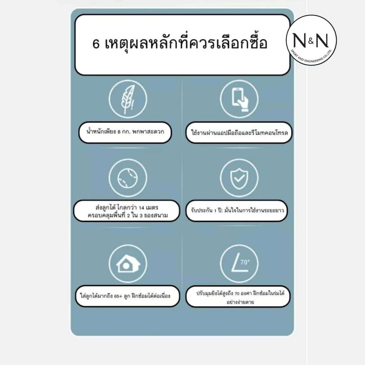 โครงสร้างวัสดุ ABS ทนทาน น้ำหนักประมาณ 8 กก. บรรจุลูกได้ 65 ลูกขึ้นไป เหมาะกับการพกไปซ้อมได้ทุกที่